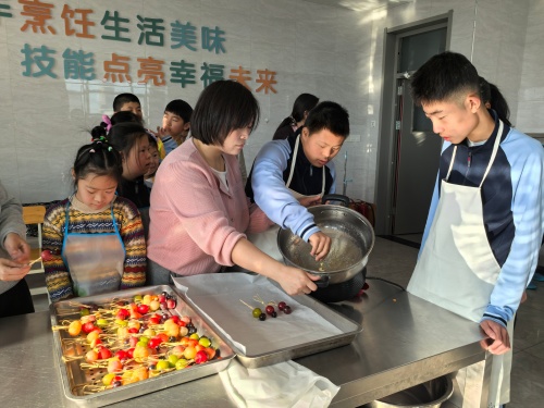 最受期待的烹饪课上,同学们分工合作,清洗葡萄、圣女果等水果,小心翼翼地用竹签串起,再均匀裹上熬制好的糖浆。当晶莹剔透的水果糖葫芦新鲜出炉,大家脸上洋溢着成就感。分享环节中,同学们互相品尝亲手制作的成果,交流制作心得,在分享甜蜜的同时,学会了合作与感恩。