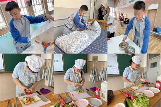 看,一声令下,比赛开始啦!穿叠衣服、整理袜子、玩具分类、舀夹花生、整理餐盘,孩子们不慌不忙,游刃有余,坚持到最后一刻;紧接着铺床单、套枕套、叠被子等居家技能的比赛,孩子们更是志在必得,展开、铺平、整理,孩子们动作一气呵成,胜券在握;最后进行的厨艺大比拼,孩子们又摇身一变,化身大厨,将手中的面包、生菜、火腿、鸡蛋等食材精心进行烹饪加工,一个个荤素搭配、营养均衡的三明治就完成啦!成功的喜悦绽放在孩子们每个人的笑脸上,劳动的乐趣也在每个人的心中扎根发芽。